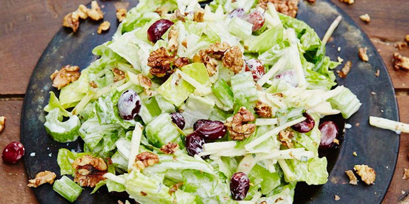 Нарезать сельдерей и яблоки небольшими кубиками. Помыть, обсушить и порвать листья салата. Все смешать, оборвать с ветки виноград, заправить соусом, посыпать сверху орехами и подавать.