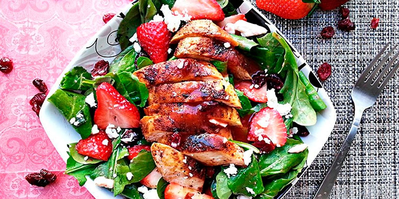 Выложить на зелень курицу, клубнику, сушеную клюкву, посыпать сыром и заправить соусом.